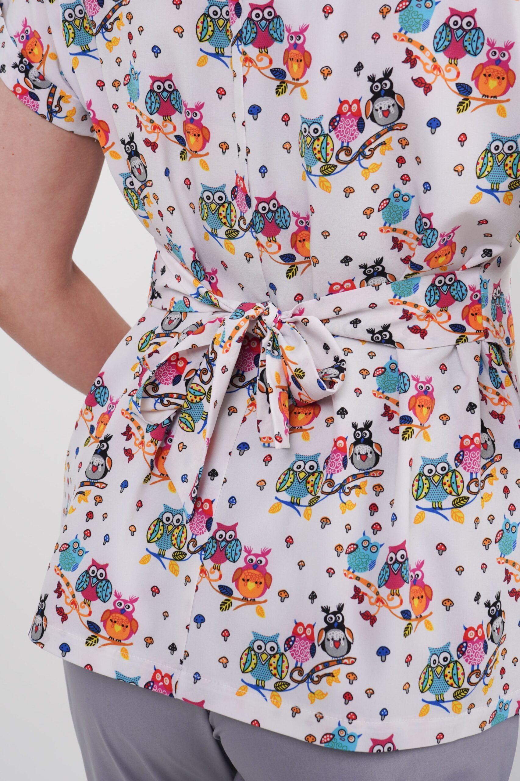 Medical Jacket Mallorca 3/4 Material: Twill. Zusammensetzung: 65 % Polyester, 35 % Baumwolle. 3/4-Ärmel, Bündchen. Verschluss: Silberner Reißverschluss mit weißem Kunststoffband. Kurze Knopfleiste am oberen Ende des Reißverschlusses. Fünf aufgesetzte Taschen. Zusätzliche Handytasche. Rückenlänge länger als Vorderseite. Gummibund im Rücken. Innen bedruckt (Bündchen innen, bedruckter Stoff).