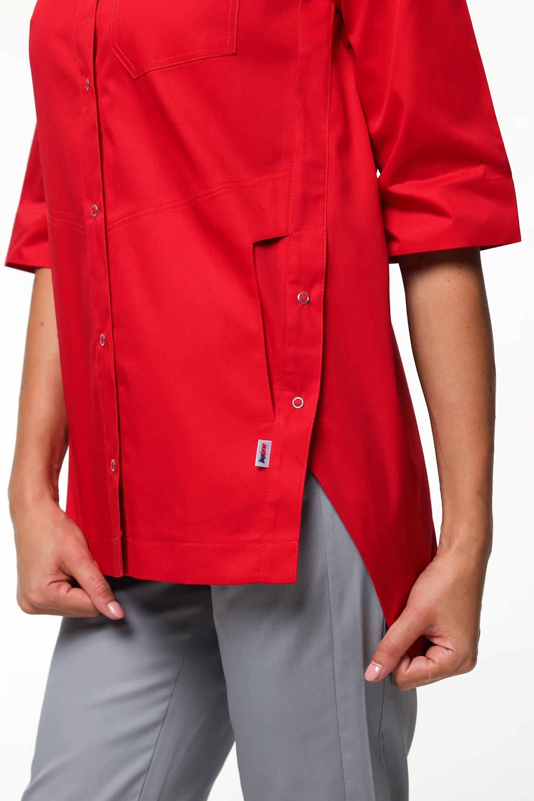 Seitliche Riemen werden mit Knöpfen bis zur Taille befestigt. Dank der seitlichen Verschlüsse lässt sich das Produkt im unteren Bereich zusätzlich anpassen.